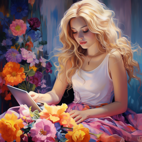 beautiful, hair, blue, pink, yellow, dress, laptop, phone, flower, pen