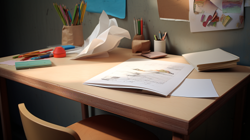 a single folder peice of paper on a childs art desk --ar 16:9 --v 5.2