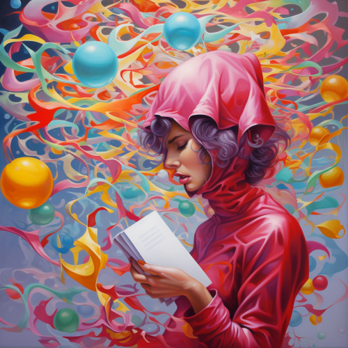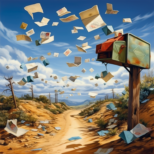 someone blowing bubbles, but instead of bubbles it's envelopes, colroful, abstract