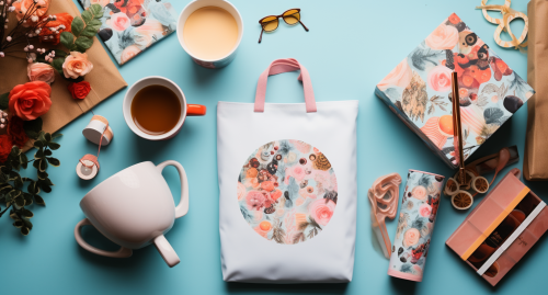 flat lay layout of muliple sublimation products that have cute designs, on a table with colorful Christmas background theme, (do not use copywrite examples) products should be specifically bookmark, notebook, makeup bag, tote bag, keychains, photo realistic, in the distance --ar 13:7