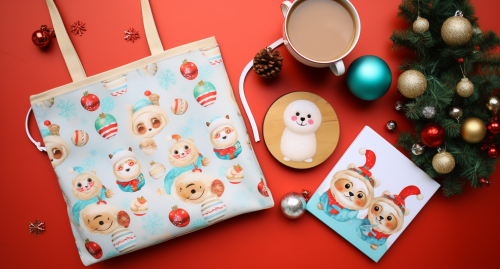 flat lay layout of muliple sublimation products that have cute designs, on a table, (do not use copywrite examples) products should be specifically bookmark, notebook, makeup bag, tote bag, keychains, photo realistic, very colorful Christmas background theme, in the distance --ar 13:7