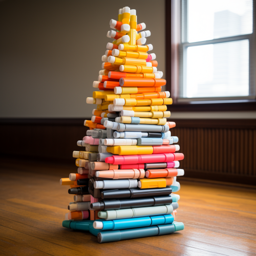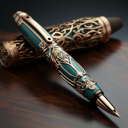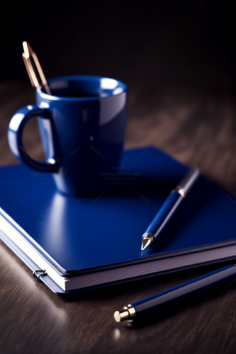 a dark blue stationary set of notebooks and pens in a coffee mug, office background, 64k high quality, ultra-realistic --ar 2:3 --v 5