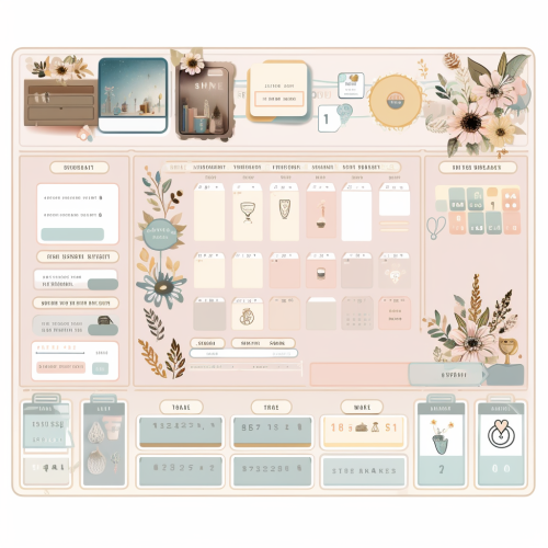Peach-colored background with stationery, a digital tablet, and a camera , office supplies such as pens, pencils, and a clock at the edges, in a flat lay arrangement --ar 443:960