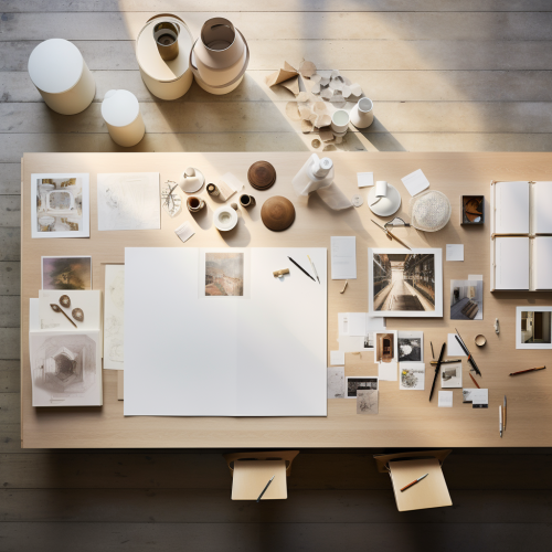 top down photograph in the style of architectural photographer rory gardiner depicting an elegant, modern timber desk with blank A1 sheets of white paper laid out, in the top right hand corner an artemide 'tolomeo' lamp is slightly visible, in the bottom right hand corner some drawing utensils