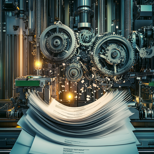 a large machine or robotic system of producing financial reports. It should be split in 2 parts. the other half strained or malfunctioning, with gears misaligned and warning lights blinking, scatter papers came from it because of malfunctioning. The other side is lfunctioning well with green lights while printing organized financial reports.