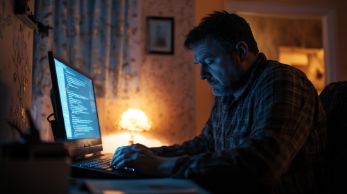 a photo of a adult man, around 35 years old at his house on his computer, afternoon and nice light, view from the front where the back of the laptop it's seen --ar 16:9 --v 6.1