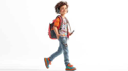 3D animation in Disney style, full-length of a friendly Kazakh boy of 10 years old, on a white background in the studio, his hair fluttering in the wind, a T-shirt with a beautiful print, fashionable jeans with patches and colorful sneakers with bright laces. A stylish backpack is slung over the shoulder, headphones are on the neck, a smartphone is in hand, high-contrast lighting, a bright and cheerful atmosphere, --ar 16:9 --v 6.1
