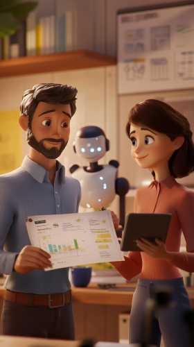 generate a photorealistic image of a scene where a bookkeeper and a small business owner are facing each other in a cozy office setting. The bookkeeper, is showing a detailed financial report with datas to the business owner, who has an expression of joy and relief. The report features positive financial data, including graphs and charts. Behind the bookkeeper, a low visibility of an AI robot with a friendly demeanor is observing the interaction, holding a small tablet displaying additional financial insights. The background should reflect a simple and small office. Utilized color peach in theme --ar 9:16