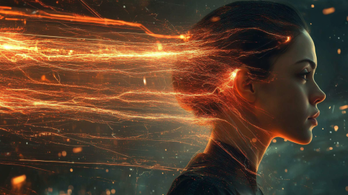 design a futuristic hightech technical image that illustrate a smooth and calm flow electrical current that that transform itself into a female office worker ridding it , --ar 16:9 --v 6.1