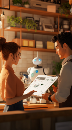 generate a photorealistic image of a scene where a bookkeeper and a small business owner are facing each other in a cozy office setting. The bookkeeper, is showing a detailed financial report with datas to the business owner, who has an expression of joy and relief. The report features positive financial data, including graphs and charts. Behind the bookkeeper, a low visibility of an AI robot with a friendly demeanor is observing the interaction, holding a small tablet displaying additional financial insights. The background should reflect a small business environment, with shelves of products or office supplies, creating a warm and inviting atmosphere. Utilized color peach in theme --ar 9:16