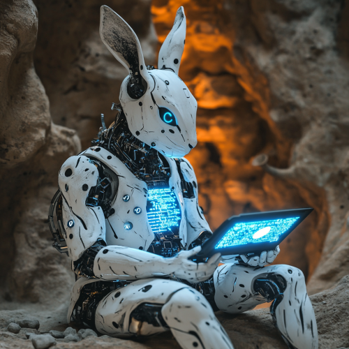 Hyper-realistic, futuristic white rabbit robot, its body made of sleek metallic parts and glowing blue circuits, dressed in primitive caveman attire made of rugged buffalo skins, sitting in a dimly-lit cave. The robot is intently developing code on a glowing holographic screen, surrounded by ancient tools, stone carvings, and futuristic tech gadgets. The scene blends prehistoric and sci-fi elements, with glowing symbols on the cave walls. The rabbit's eyes reflect both intelligence and the primitive setting around it. Realistic textures, high contrast lighting, and intricate details in both the robot and its caveman outfit.
