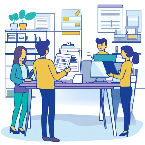 Create a clean, vector-style illustration of a school setting where staff members are completing a checklist while counting computer equipment. Show a group of people in a modern computer lab or classroom, inspecting desktop computers, laptops, and tablets. One person holds a clipboard with a checklist, while another checks off items on a tablet. The background includes neatly arranged desks, shelves with tech accessories, and cables. Use crisp lines, bright colors, and minimal shading to emphasize organization and teamwork in a tech-focused environment.