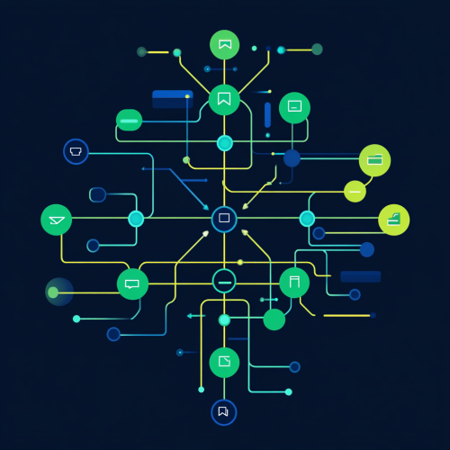 Design a visual representation of a decision model. The decision model should have multiple branching nodes, each representing a decision point, with labeled connections leading to further choices or outcomes. The layout should be clean, organized, and visually intuitive, starting from a central 'decision' node and expanding outward into different possible paths. Each branch should have clear labels for decisions or conditions, leading to outcomes that show potential results. The overall design should be modern, with a professional and clean aesthetic. 2 colors bright green and bright blue. solid background dark blue. 8k