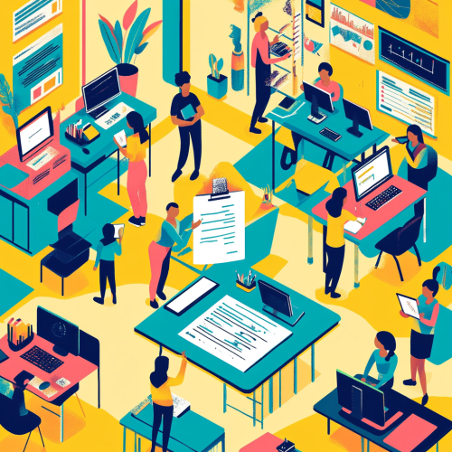 Design a vibrant, vector-style illustration of a school setting where staff members are actively completing a checklist while counting computer equipment. Showcase a lively computer lab or classroom with bright, engaging colors. Include a group of diverse staff members inspecting desktops, laptops, and tablets, with one person holding a colorful clipboard checklist and another using a tablet to check off items. The background should feature colorful desks, tech accessories, and cables neatly arranged. Incorporate playful, bold colors and clean lines to create a fun yet organized atmosphere focused on technology management