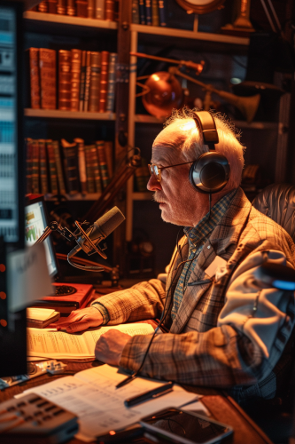 A photorealistic scene of a voice-over artist in a modern recording studio, narrating the storyline for an escape room based on the Industrial Revolution. The artist wears headphones and speaks into a high-quality condenser microphone, surrounded by acoustic foam panels and vintage-style decor. The studio desk is cluttered with historical notes, a script, and a digital soundboard. Warm, focused lighting highlights the concentration on the artist's face, while the background shows shelves lined with books and antique industrial models, creating an atmospheric blend of modern and historical elements --ar 2:3 --v 6.0