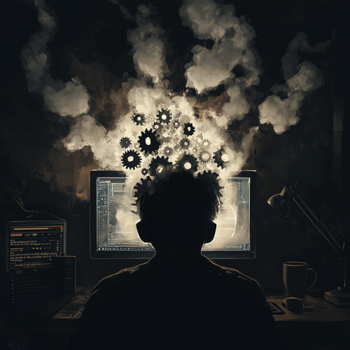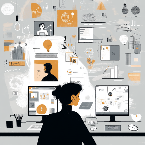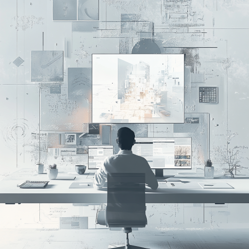 Generate a digital art for A digital art scene showing a remote worker seamlessly adapting to new technologies and challenges. The background features a modern home office with various digital tools and devices, all in shades of light gray. The worker is depicted as flexible and dynamic, symbolizing adaptability in a remote work environment. --ar 1:1