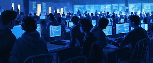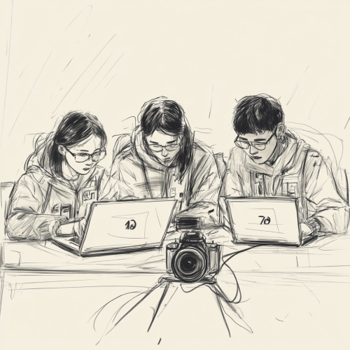 Generate a digital art for A digital art scene showing a professional in a modern classroom setting, engaging in skill development activities like coding on a laptop and attending a virtual workshop. The background is filled with abstract elements representing growth and learning. Use shades of light gray for the background. --ar 1:1