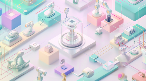 High-quality phot in pastel colors, showing AI applications across industries. Small scenes depict manufacturing with robotic arms assembling parts under AI inspection, customer service with a virtual assistant helping customers, logistics with AI optimizing delivery routes, and healthcare with a doctor analyzing patient data using AI. Each scene connects to a central AI hub in the middle, symbolizing AI interconnection across industries. Modern, clean, and informative style with icons on a white background for clarity --ar 16:9 --v 6.0