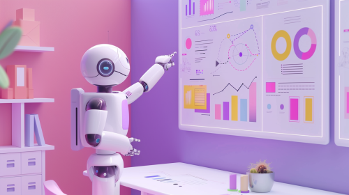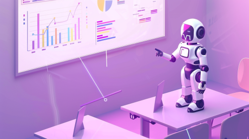 Classroom scene with a smart AI robot presenting information, pointing towards a board filled with colorful charts and flow diagrams. The design is modern, flat, and infographic-style, with pastel tones (white, purple, pink, yellow) for a friendly yet informative feel. The layout is simple and emphasizes clarity, with isometric elements , hd quality --ar 16:9 --v 6.0