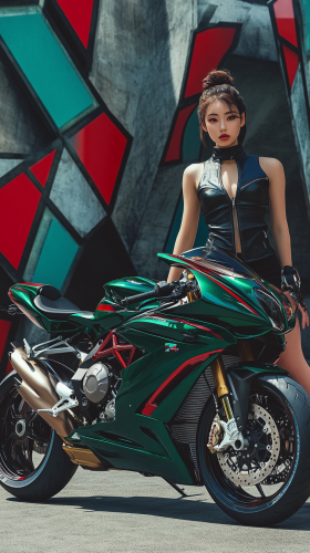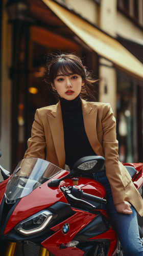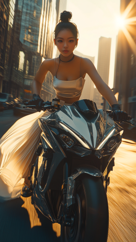 A young Japanese woman with her hair styled in an elegant bun is confidently seated on a glossy black Ducati Panigale V4. She is wearing a tailored navy blue suit with a fitted skirt that accentuates her figure. The sunlight reflects off the bike’s sleek design as she gazes thoughtfully into the distance, exuding both professionalism and style. The backdrop features a modern city skyline, enhancing the sophisticated atmosphere of the scene. Photorealistic, highly detailed, 8K resolution --ar 9:16 --v 6.1 --style raw
