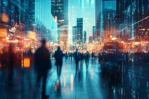 A dynamic urban scene showcasing tech professionals engaged in work or networking within a modern, innovative environment, highlighting the city's appeal for those in the tech industry. --ar 3:2