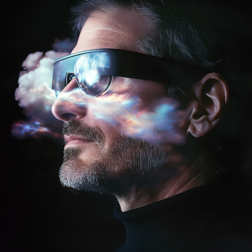 Steve Jobs wearing Augmented Reality glasses (black glasses that look like normal reading glasses) and looking at a hologram display in style of 3D anime, whispy clouds, breathtaking