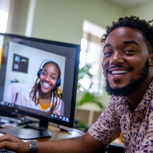 smiling Caribbean black male and female college students with astonished looks on their faces on a zoom video conference call on a computer in classroom setting.