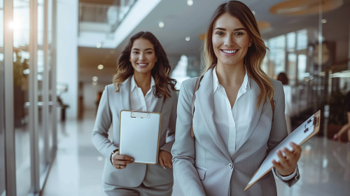 A photo of two European business women in grey suits, smiling and holding an iPad while walking through the lobby of their office. They have dark hair with highlights, and they hold clipboards. The woman on the right has her hands outstretched, as if she is showing something from the iPad screen to the other person. The background shows a modern white interior design with large windows and natural light. Taken with a Nikon D850 DSLR, using an EF24-70mm f/3 lens, in focus. --ar 16:9 --s 250 --v 6.0