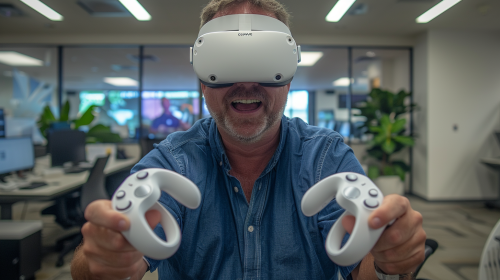 an 8k photo of a European male in his 30s wearing an HTC vive headset and holding motion controllers, well-lit modern office background, light background colors --ar 16:9 --stylize 250 --v 6.0