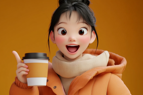 A Pixar-style 3D animation of a young Korean woman in her 20s holding a coffee cup in one hand, with her other hand pointing at the viewer. She has a surprised and delighted expression, as if asking, 'You too?' Her wide eyes and friendly smile convey excitement and connection. Virtual camera settings: Canon EOS R5, f/4, ISO 160, shutter speed 1/80 sec. --ar 3:2 --v 6.1