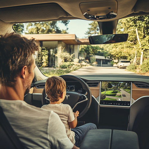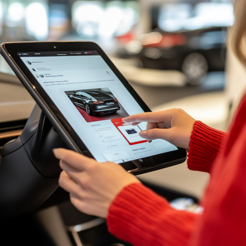 A consumer touches the tablet, which displays information about an electric vehicle, including the model and the scheduled time for the test drive. This interactive feature allows the consumer to easily access important details and confirm their appointment, enhancing the overall experience at the dealership.
