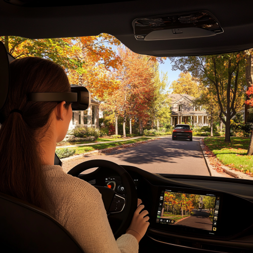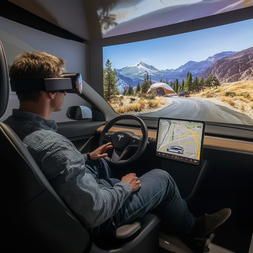A man wearing an AR device sits in the driver's seat of an electric vehicle showroom, simulating driving the car. On the wall in front of him, two projections appear: the upper projection depicts a camping scene in the mountains, while the lower projection shows a split-screen view of the vehicle automatically driving to a hospital, with the sub-screen displaying a route map from the vehicle's location to the hospital.