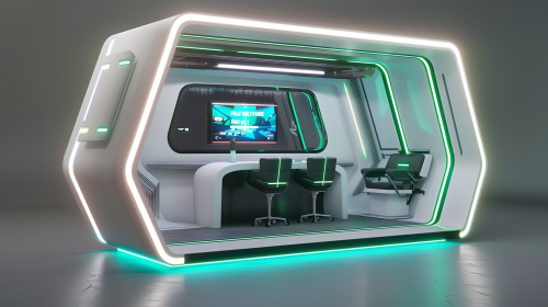 concept rendering of a massive 500 square meters pavillion that aim to engage visitors with the police department. it includes gaming area, virtual reality simulations and media glass that gives a futuristic vibe. the main colors are white and green. octane render --ar 16:9 --v 6.0