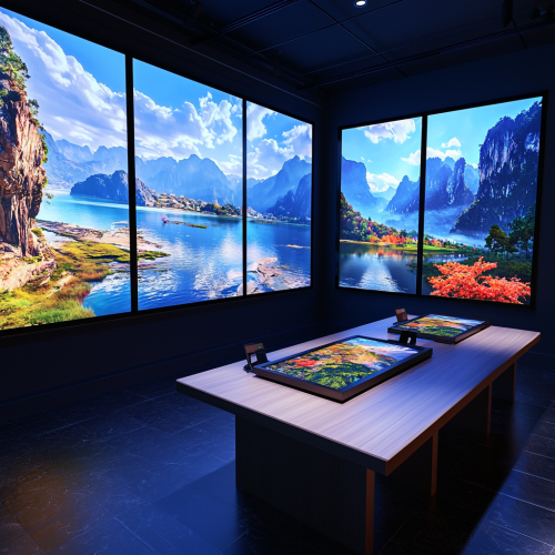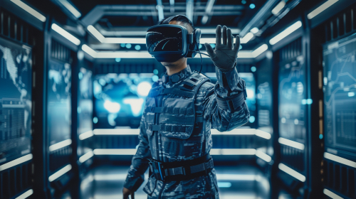 concept rendering of a training center for military and police that uses Virtual Reality, Touchscreens and interactive technologies. --ar 16:9 --v 6.0