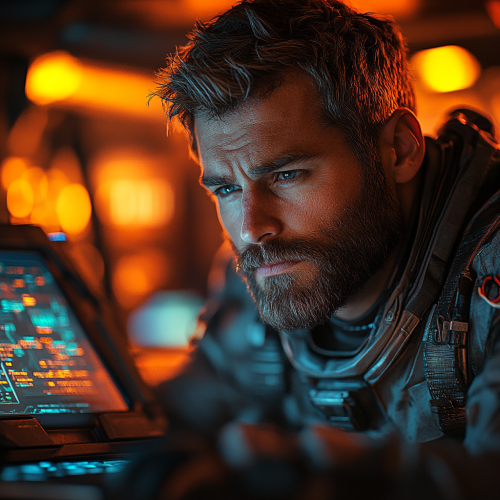Half-length photo of a bearded handsome muscled elegant male, sitting at a futuristic desk with hologram screen, tired, sleepy, bright room background, dark color scheme, Unreal engine, bright atmosphere, close-up, HD details, high resolution, realistic details --s 750