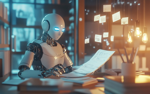 AI analyzing a list of repetitive tasks, sorting them by routine, with accounting, translation, and customer service icons floating nearby, cinematic lighting, --ar 8:5
