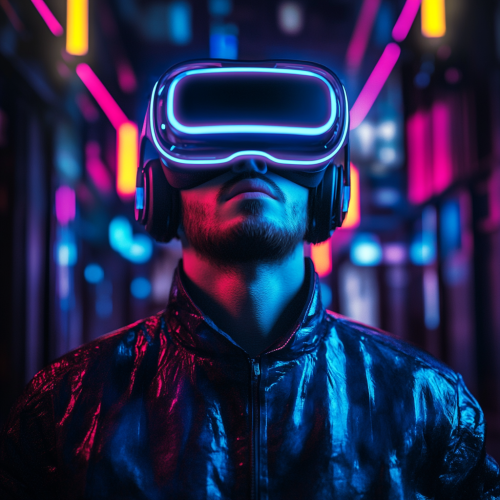 Un homme de nationnalité américaine, Ayant comme coupe de cheveux une middle part. En regardant en haut a droite. Portant une veste et un casque de réalité virtuelle, entouré de lumière néon bleue et verte en majorité , et un fond avec un peu de brume avec une ville au japon éluminer avec des led en flou. Un portrait en pied, surréaliste et hyperréaliste, dans un style esthétique cyberpunk photographique. L'image est hyperréaliste, rendue avec Octane, haute résolution, étalonnage professionnel des couleurs, ombres douces, contraste minimal. --ar 1:1