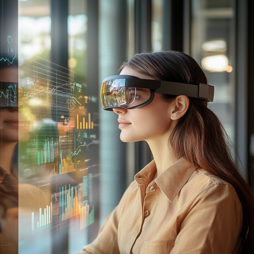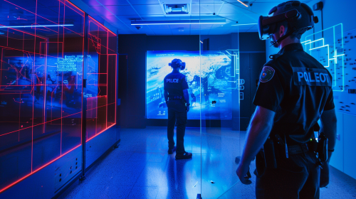 concept image of a Dubai police officer wearing a Meta Quest 3 headset. in the background a dashboard with different statistics and infographics --style raw --v 6.1 --ar 16:9 --c 12 --s 400 --no text