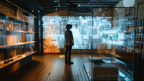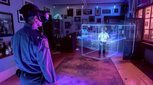 a room where through Mixed Reality is possible to analyze a crime scene. the police officer is interacting though the virtual reality but he can also interact with physycal element of the scene, The police officer is scanning the scene. above every elements he can see a caption with the tutorial information --ar 16:9 --v 6.0