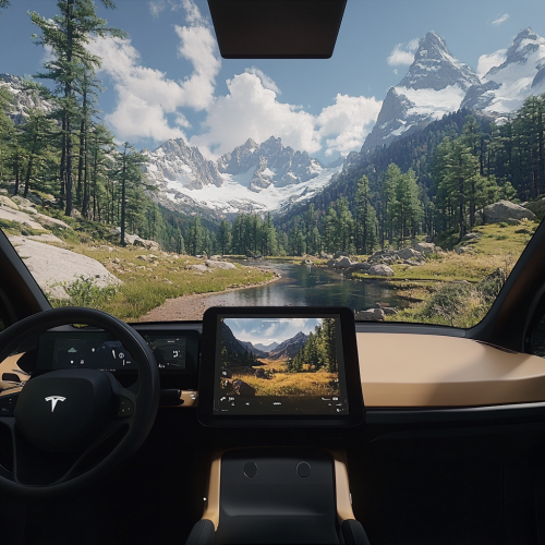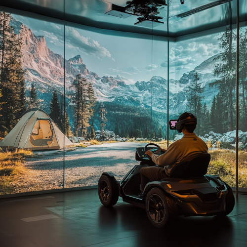 The electric vehicle driver uses an AR device to simulate a solo drive to a mountain area for camping. The vehicle activates its overnight mode, and the screen shows that it can sustain over three days of battery life while stationary.