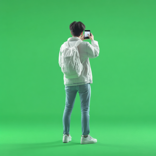create a wide photo of a full body excited pedestrian standing with their back turned to you. They take pictures on their phone, with a green screen background, very realistic, photorealistic