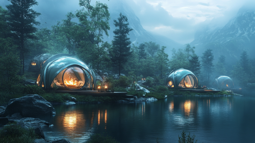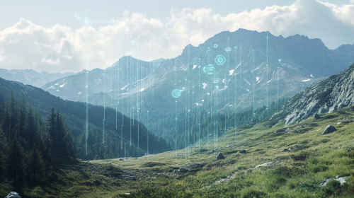 Scenic mountain landscape with a subtle overlay of data lines and holographic icons, showing trail data and eco-footprint markers, soft integration of digital visuals into the natural scenery, minimalist yet informative --ar 16:9 --v 6.1