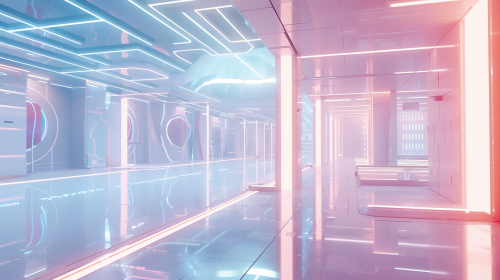 rendering of the concept of an innovation lab where staff can use and train using Augmented REality, Virtual Reality and Mixed Reality. The look and feel is futuristic and minimal and use white and some cyberpunk color accent. octane --ar 16:9 --v 6.0