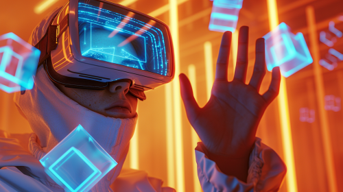 A white person wearing virtual reality glasses uses their hands to interact with holographic images of cubes and rectangular blocks on the screen, which glow in blue light against an orange background with neon stripes. The individual is dressed in white . Bright colors, high detail, high resolution, hyper-realistic photography, sharp focus, intricate details, beautiful lighting, shot on a Canon EOS R5.