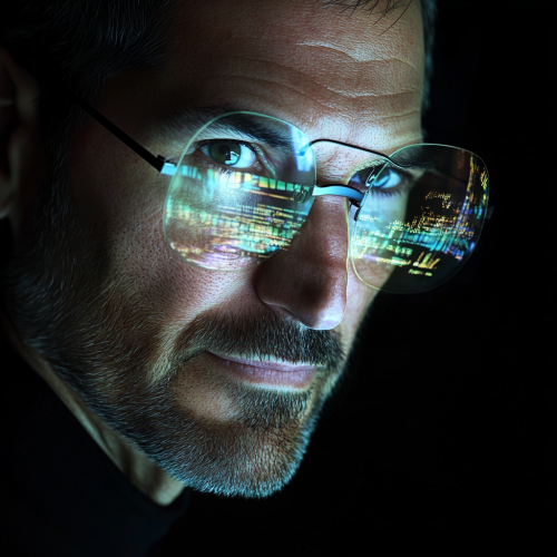 Steve Jobs wearing Augmented Reality glasses (black glasses that look like normal reading glasses) and looking at a hologram display in style of 3D anime
