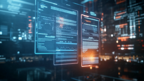 A close-up of a modern, transparent tablet placed on a minimalist desk in a tech-forward workspace, with holographic icons and data streams projected above the screen, soft ambient lighting adding depth and clarity, captured with a Nikon Z7 II, macro lens, subtle grayscale with blue highlights for a tech-inspired aesthetic