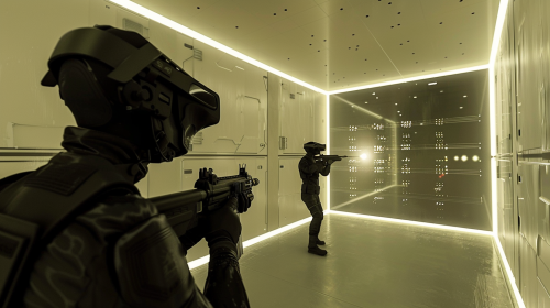 concept for a room that blends virtual reality environment with real life architecture. the room and the virtual reality experience are training a bomb squad. octane --ar 16:9 --v 6.0
