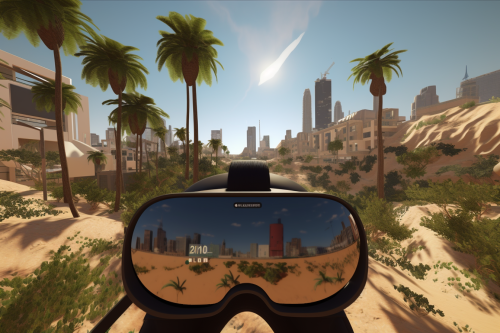 A close-up view of a VR headset displaying a scene that looks like a miniature 3D model landscape of a modern cityscape merging with desert and greenery. The VR display should feature a stylized map with buildings, trees, and desert areas in a realistic but slightly artistic style. The city buildings should be densely packed and rise up along a coastline, transitioning into green areas and a desert landscape. The VR headset should look sleek and modern, and the image should feel immersive and detailed, capturing the contrast between the urban and desert terrain --v 5.0 --ar 3:2
