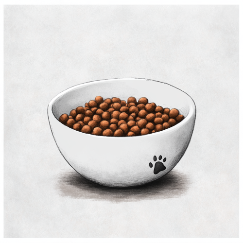 high detailed watercolor clipart small beautiful bowl, full bowl of quality cat food, brown round granules, beautiful small white bowl with black simple tiny delicate cat paw design, tiny design around the whole bowl, cat bowl, luxury aesthetic, side view, beautiful illustration with realistic details, high resolution, gray background