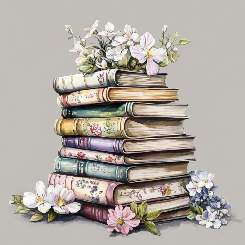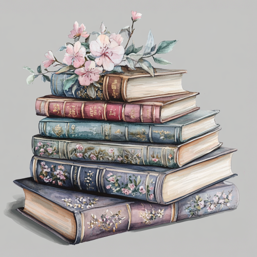 highly detailed watercolor clipart, beautiful pile of books, stacked on top of each other, decorated covers, naturally composed illustration, a touch of spring, soft colors, luxurious aesthetics, beautiful illustration with realistic details, high resolution, gray background